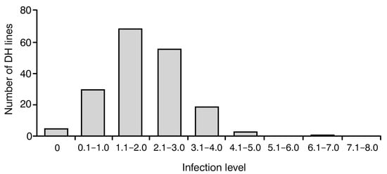 To investigate the level of resistance to blackleg in analyzed 183 DH lines, the frequency of disease symptoms was assessed using a 0–9 severity scale. On this scale, 0 indicates no visible disease damage and 9 indicates a completely damaged plant. The analysis of variance showed a significant effect (p < 0.001) in their genotype on the observed degree of resistance to blackleg. Notably, all plants were infected with Leptosphaeria spp. in varying degrees, ranging between 0 and 7, with an average value of 2.05 ± 1.06. Most of them (179) displayed satisfactory blackleg disease resistance with a score of 0–4. No plants with infection levels of 8–9 were observed (Figure 1).