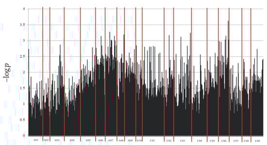 Among 12,948 markers selected for association mapping, 15 markers located on the B. napus chromosomes A06, A07, A08, C02, C03, C06 and C08 were found to be linked to blackleg resistance at the highest significance level, p < 0.001. Their greatest concentration was observed on chromosome A07 (Figure 3). This finding aligns with previous estimations indicating that this chromosome harbors the most R genes, which are responsible for disease resistance in plants []. However, it is crucial to emphasize that the A07 chromosome is not the sole repository of R genes against fungal infections. Rather, this group is dispersed throughout the rapeseed genome, as evidenced by the presence of the selected markers on several other chromosomes.