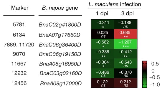 A heatmap showing changes in the expression levels of seven B. napus genes that harbor selected markers caused by Leptosphaeria maculans 1 and 3 days post-inoculation (dpi). The heatmap depicts log2-fold changes in transcriptomic data acquired from Becker et al. (2019). Intensity of red indicates upregulated gene expression, while the intensity of green indicates downregulated gene expression. Significant differences from the mock-treated plants were determined using two-tailed Student’s t-test. * p < 0.05; ** p < 0.01; *** p < 0.001; ns, not significant.