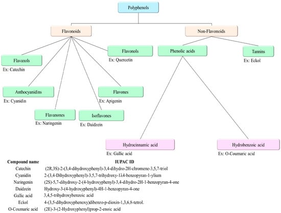 Flavonoids are divided into six major groups []. Each group has specific chemical characteristics, and Table 1 summarizes the differences among these groups [,,].