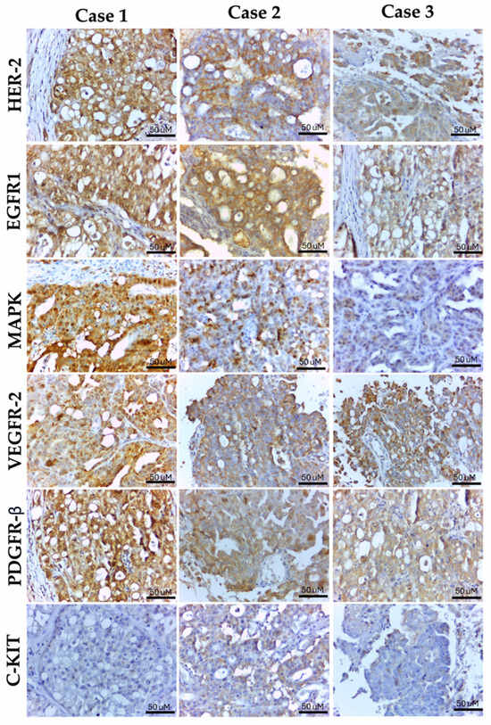 Immunoexpression of each marker in urinary bladder carcinoma (case 1), prostatic carcinoma (case 2), and carcinoma in mixed tumor (Case 3). Case 1 showed human epidermal growth factor receptor 2 (HER-2) membranous, epidermal growth factor receptors 1 (EGFR1) membranous and cytoplasmic, extracellular signal-regulated kinase 1/2 (ERK1/ERK2) cytoplasmic and nuclear expression, and both membranous and cytoplasmic for vascular endothelial growth factor receptor 2 (VEGFR-2) and platelet derived growth factor receptor beta (PDGFR-β) expression in over than 75% of neoplastic cells. This case showed a negative c-KIT expression. Case 2 had positive membranous HER-2 expression and positive nuclear and cytoplasmic ERK1/ERK2 expression in more than 50% of neoplastic cells. This case also showed positive membranous and cytoplasmic EGFR1, VEGFR-2, and PDGFR-β expression in over than 75% of neoplastic cells. Also, cytoplasmic expression was identified for c-KIT in less than 25% of neoplastic cells. Case 3 presented HER-2 membranous expression in less than 25% of neoplastic cells (there is more cytoplasmic than membranous expression and cytoplasmic expression was not assessed). This case also showed ERK1/ERK2 cytoplasmic and nuclear expression in lower than 25% of neoplastic cells. Membranous and cytoplasmic EGFR1, VEGFR-2, and PDGFR-β expression in over 75% of neoplastic cells have also been identified, and scattered cytoplasmic c-KIT expression in less than 10% of neoplastic cells was found.