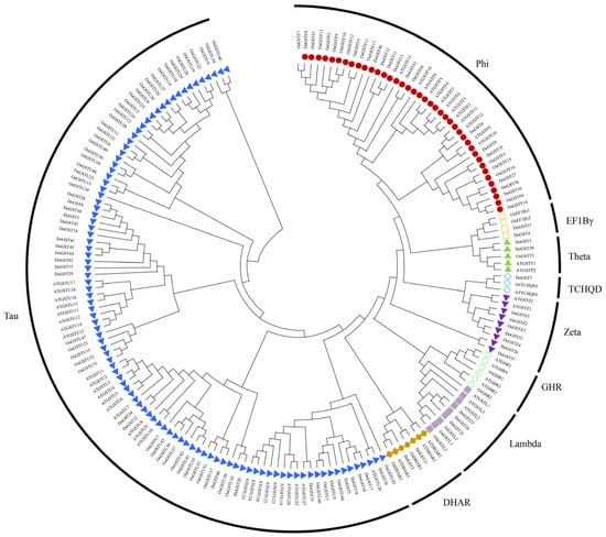 Phylogenetic analysis of the GST gene family protein sequences from D. officinale, rice, and Arabidopsis was performed using the maximum likelihood method in MEGA software. After comparing the results, the GST proteins were categorized into nine groups, including phi, EF1Bγ, theta, TCHQD, zeta, GHR, lambda, DHAR, and tau. Among them, the tau branch comprised 22 family members, accounting for 47.8% and representing the largest branch of the GST gene family in D. officinale. The phi, EF1Bγ, theta, TCHQD, zeta, GHR, lambda, and DHAR branches contained 11, 2, 2, 1, 3, 0, 3, and 2 family members, respectively (Figure 1).