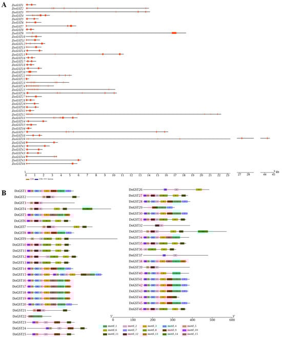 Figure 2. Gene structures and conserved motifs of DoGSTs. (A) Exon-intron organization of DoGST genes. Exons are shown as red rectangles; introns are shown as gray lines. (B) Composition and distributions of conserved motifs in DoGST proteins. The conserved motifs are represented by different numbers and rectangle colors.