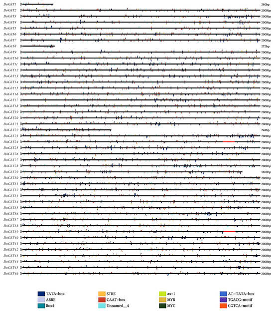 Figure 3. Prediction of TF binding sites on the promoter of GST family genes in Dendrobium officinale. The 2 kb upstream of the translation site was obtained for analysis, and the different colors represent the different of cis-acting elements in the promoter region of each DoGST gene.