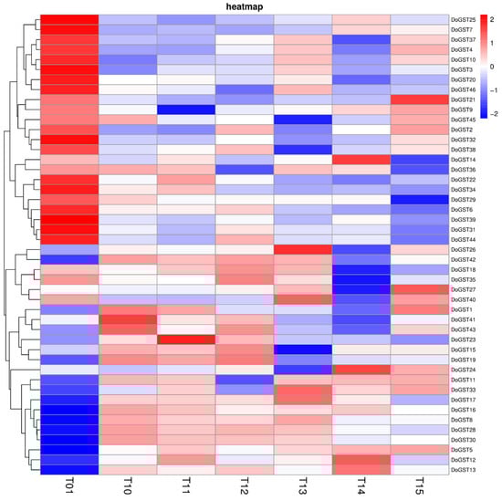Figure 4. Expression analysis of GST family genes in response to Cd stress in Dendrobium officinale. T01 represents 0 mg·L−1 Cd treatment as the control. T10, T11, and T12 represent three biological repeats of 14 mg·L−1 Cd treatment for 15 days. T13, T14, and T15 represent three biological repeats of 14 mg·L−1 Cd treatment for 30 days.