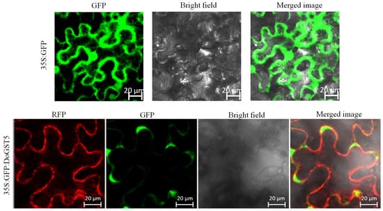 The CDS of DoGST5 without a stop codon was cloned into the binary vector 35S::GFP (modified from pCAMBIA1300). The primers used are listed in Table S3. The resultant DoGST5-GFP vector was transformed into Agrobacterium tumefaciens and cultured in 4 mL of LB medium containing kanamycin resistance. The culture was shaken at 28 °C and 200 rpm until the OD600 reached approximately 0.6. After centrifugation at 8000 rpm for 6 min, the supernatant was discarded, and the same volume of MES solution (10 mM MES with pH = 5.6, 10 mM MgCl2, and 0.2 mM acetosyringone) was used for resuspension. After centrifugation, the pellet was resuspended in an equal volume of MES solution and incubated at room temperature for 2 h. Tabacco (cultivated for 45 days) was injected into the backs of the leaves using a sterile syringe and incubated for three days. The GFP fluorescence of the leaves near the injection site was observed using a laser confocal microscope (LSM880: Karl Zeiss, Leica, Germany).