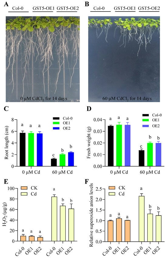Figure 6. Overexpression of DoGST5 enhances Cd tolerance in Arabidopsis by reducing the excessive accumulation of ROS induced by Cd stress. (A,B) Phenotypic analysis of Cd tolerance in Arabidopsis overexpressing DoGST5. Col-0 and DoGST5 overexpression Arabidopsis lines were cultured on 0 and 60 μM 1/2 MS solid medium for 14 days. (C,D) Primary root length and fresh weight of Col-0 and DoGST5 overexpression lines. Data are means ± SD (n = 5). (E,F) Overexpression of DoGST5 in Arabidopsis reduces excessive ROS levels induced by Cd stress. Columns with different letters indicate significant differences (p  <  0.05) using one-way ANOVA with Tukey’s test for multiple comparisons.