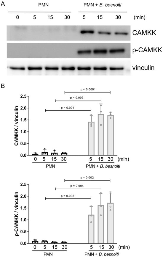 2.2. Tachyzoite Exposure Drives Significant CAMKK Upregulation and Phosphorylation in PMN
