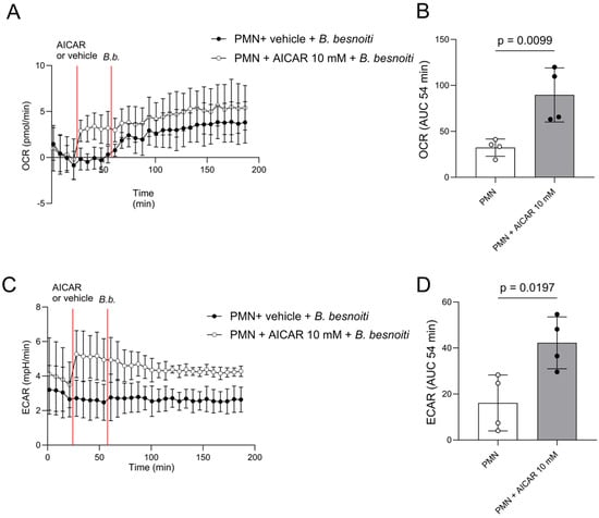 2.5. AICAR Treatments Induce Metabolic Responses in Bovine PMN but Do Not Synergize with B. besnoiti-Induced OCR and ECAR