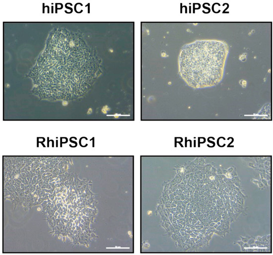 The morphology of human (hiPSC1 and hiPSC2)- and rhesus macaque (RhiPSC1 and RhiPSC2)-induced pluripotent stem cell colonies in feeder-free culture conditions. Scale bars: 50 µm.