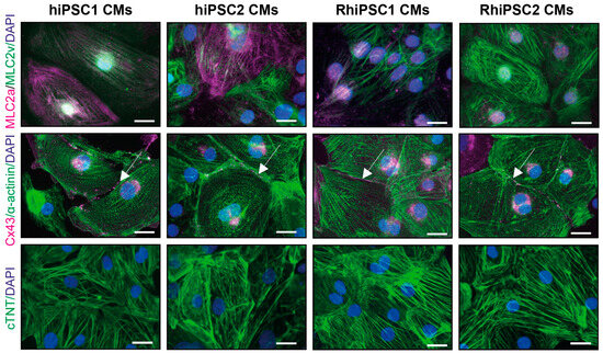 Marker expression of iPSC-derived cardiomyocytes. Immunostaining of hiPSC- and RhiPSC-derived cardiomyocytes. Cardiomyocyte markers, such as myosin light chain 2 ventricular (MLC2v), myosin light chain 2 atrial (MLC2a), α-actinin, cardiac troponin T (cTNT; encoded by the TNNT2 gene) and connexin 43 (Cx43) were detected. The fluorescence images show the typical structure and morphology of iPSC-cardiomyocytes forming striated patterns of sarcomeres. The cell nuclei were stained with DAPI. Scale bars: 20 µm.