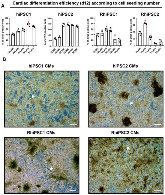Directed cardiac differentiation of hiPSCs and RhiPSCs. (A) The flow cytometric measurement of cTNT (encoded by the TNNT2 gene) signal shown at day 12 of differentiation in the four cell lines is seeded at different cell numbers/well. The red arrow indicates the number of cells/well resulting in the highest percentage of cTNT-positive cells for each of the four cell lines. (B) The morphology of human and rhesus iPSC-CMs is shown upon the optimization of the seeding number on day 12 from the beginning of differentiation. The white arrows indicate beating cardiac tissues that form net-like structures. Scale bars: 100 µm.