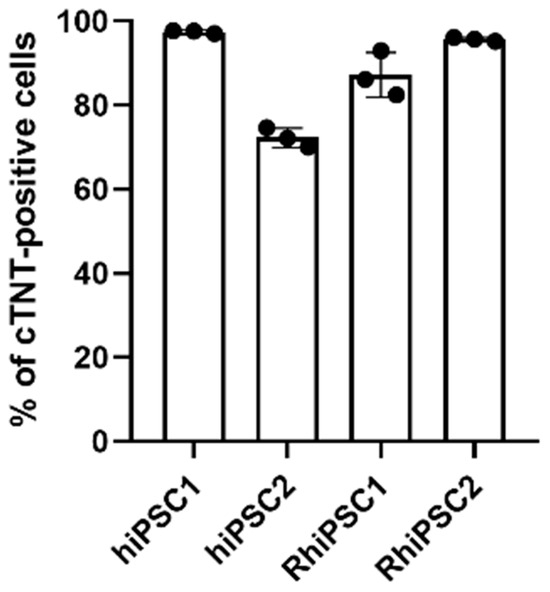 Flow cytometry analysis of the purity of the hiPSCs- and RhiPSC-derived cardiomyocyte populations after seven days of metabolic selection with lactate (as percentage of cTNT-positive cells; n = 3/cell line).