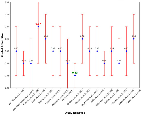 The blue dots represent the pooled effect size estimates when each study was excluded from the analysis, while the red lines show the corresponding 95% confidence intervals. The sensitivity analysis demonstrated the strength of the overall findings, as the pooled effect size estimates remained relatively stable across the removal of different studies. Notably, the exclusion of Sokol et al. [40] resulted in a slightly higher pooled effect size (red colour), indicating its influence on the overall estimate. On the other hand, the removal of Crothers et al. [45] (green colour) resulted in a lower pooled effect size. However, the overall consistency, regardless of which study was removed, suggested that the results were not excessively dependent on any single study.
