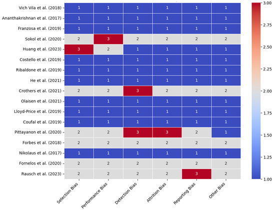 Figure 3 presents a heatmap of the risk of bias analysis across the studies, assessing six categories: selection bias, performance bias, detection bias, attrition bias, reporting bias, and other biases. It identifies areas of potential bias, helping to critically assess the reliability of the findings. The color gradient ranges from blue (low risk) to red (high risk), providing a visual representation of the bias levels. Most studies, such as those by Vich Vila et al. [37] and Ananthakrishnan et al. [38], display a low risk of bias across all categories. However, studies such as those by Huang et al. [41] and Pittayanon et al. [49] show higher risks in specific categories, such as selection and performance bias, suggesting areas of potential methodological weakness. The uniform blue seen in many cells points out the general reliability of the findings, while the red and gray areas highlight where caution should be applied when interpreting results.