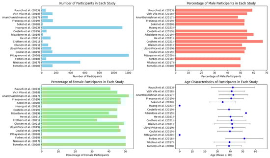 The bottom right scatter plot with error bars describes the age characteristics of participants, showing the mean age and standard deviation for each study. Notably, Ribaldone et al. [43] reported the highest mean age of participants, at 52.5 years, suggesting a focus on an older cohort, whereas Sokol et al. [40] and He et al. [44] targeted slightly younger populations. The inclusion of Rausch et al. [53], with a mean participant age of 42.07 years and a standard deviation of 17.14 for their study, indicated a broad age range within this study, reflecting its diverse participant pool.