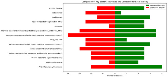 Ribaldone et al. [43] demonstrated that adalimumab therapy in CD patients led to a significant increase in Firmicutes and Bacteroidetes and a decrease in Actinobacteria and Proteobacteria. This shift in microbial composition is associated with improved clinical outcomes. Similarly, Rausch et al. [53] found that anti-inflammatory treatments in IBD patients increased the abundance of beneficial bacteria such as Faecalibacterium prausnitzii, Roseburia, and Bifidobacterium, while harmful bacteria such as Escherichia coli and Clostridioides difficile decreased, further supporting the literature [70,71] on the importance of microbiota modulation in managing IBD.