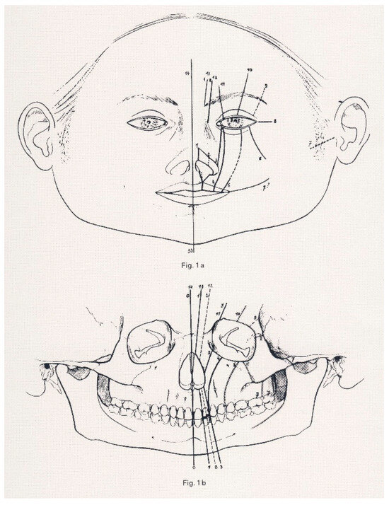 The original Tessier anatomical diagram of craniofacial clefts: localization on the soft tissues (a) and skeleton (b). Dotted lines are either uncertain localizations or uncertain clefts. Reprinted with permission from Ref. [15]. 1976, Elsevier.