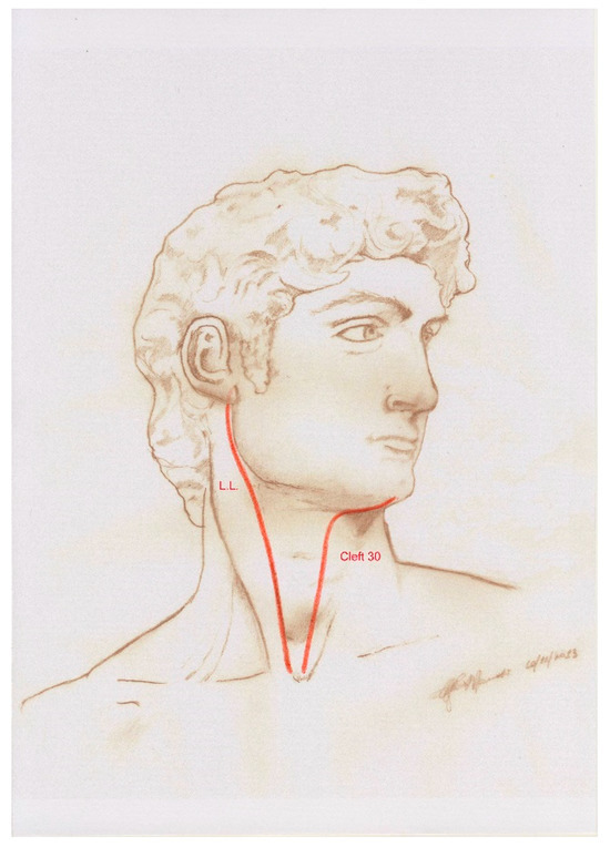 Anatomical diagram of the typical sites of congenital clefts, fistulas, and cysts of the neck: the laterocervical line (L.L.) and the anterior neck midline (Tessier cleft number 30). Reprinted with permission from Ref. [14]. 2014, Wolters Kluwer Health.