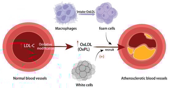 LDL may be modified in a number of ways, the most common being oxidation, which can result in As [4]. Other alterations include glycation and oxidative modification. Oxidized low-density lipoprotein (Ox-LDL) resulting from oxidative modifications, such as oxidized phospholipids (OxPLs), can be ingested by macrophages, which subsequently transform into foam cells [94,95]. The build-up of foam cells increases the risk of lipid streaks and even lipid plaques, which ultimately cause CVD to occur and progress. Furthermore, the build-up of cholesterol within macrophages stimulates inflammatory reactions, which, in turn, triggers the activation of the NLRP3 inflammasome through NF-κb-mediated activation, the production of pro-inflammatory cytokines, and the aggravation of the chronic inflammatory state of atherosclerosis [96]. This also damages the vascular endothelium and increases the expression of adhesion molecules [97], which, in turn, triggers more macrophage aggregation and matrix metalloproteinase (MMP) expression, diminishing the stability of As plaques and aggravating the spread and development of As plaques [98,99]. Shi et al. found that BAT-derived neuromodulin-4 (neuregulin-4 (Nrg4)) inhibited Ox-LDL-induced inflammatory responses (TNF-α, IL-1β, and IL-6) and the migration of RAW264.7 cells. In vivo, Nrg4 was shown to reduce endothelial damage and ameliorate the onset and progression of As in mice [100]. In experimental and in vitro studies in HFD-fed mice, Gang Luo and colleagues found that inhibiting p38 MAPK phosphorylation and p16 expression in the p38 MAPK/p16 pathway dramatically decreased Ox-LDL-induced macrophage senescence and reduced the development of As [101]. Furthermore, glycated low-density lipoprotein (G-LDL), which is produced when LDL glycation is modified, stimulates macrophage foam cell formation, increases oxidative stress and inflammation in human endothelial cells, and binds to scavenger receptor A (SR-A) to upregulate SR-A gene expression and extend its half-life, which stabilizes the transfer of more G-LDL and exacerbates the As outbreak [102]. As a result, anomalies in lipid metabolism cause LDL to aggregate underneath the endothelium in the artery vasculature, which aids in the onset and advancement of As (Figure 1).