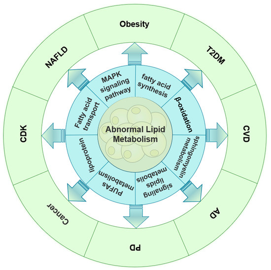 The complex physiological process of lipid metabolism is involved in the regulation of nutrients, hormones, and organismal homeostasis [1]. Abnormalities in lipids and their metabolites in the segments of synthesis, storage, and catabolism tend to alter plasma lipoprotein levels, structure, and function, which, in turn, cause the emergence and progression of related diseases [2]. The normal function of its various components is essential for maintaining the health of the body. In recent years, with the improvement of people’s living standards, dietary habits, and lifestyle changes, the incidence of lipid metabolism disorders and the incidence of many human diseases related to them have shown an increasing trend [3]. Being the most prevalent metabolic disease of the endocrine system, obesity is primarily caused by improper lipid metabolism and excessive caloric intake. Disorders related to lipid metabolism also exacerbate the development and occurrence of obesity. One of the common metabolic diseases affecting the endocrine system is type 2 diabetes mellitus (T2DM). Recent research has linked abnormalities in lipid metabolism to the onset and progression of the disease. Additionally, pathological studies have revealed that ectopic adipose tissue surrounds the β cells in the pancreatic islets, exacerbating the abnormalities in insulin secretion. Simultaneously, aberrant lipid metabolism also raises the risk of cardiovascular disease (CVD), particularly atherosclerosis and coronary heart disease [4,5]. It has been discovered that aberrant lipoprotein and polyunsaturated fatty acid metabolism contribute to the onset and progression of CVD, and an increasing number of studies has shown that abnormal lipid metabolism can either directly or indirectly raise the incidence of cardiovascular disease and mortality [6,7,8,9]. Anomalies related to the metabolism of lipids can impact not only the beginning and course of metabolic disorders but also the development and advancement of cancer. One of the defining characteristics of the development of cancer is abnormal intracellular lipid metabolism, whereby increased fatty acid (FA) de novo synthesis results in intracellular lipid accumulation in cancer cells, as well as increased levels of β-oxidation (intracellular oxidative stress) and, subsequently, more energy. Additionally, abnormal lipid accumulation occurs in the tumor microenvironment (TME), exacerbating tumor infiltration and further contributing to the creation of an immunosuppressive tumor microenvironment, which allows tumor cells to evade immune attack. Chronic disorders like neurodegenerative diseases, nonalcoholic fatty liver disease (NAFLD), chronic kidney disease (CKD), and osteoarthritis are also accompanied by abnormalities in lipid metabolism.
