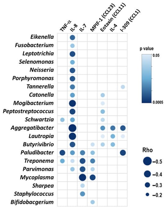 Most representative significant negative (blue) correlations between blood inflammatory markers and the relative abundance of bacterial genera. Bubble size represents the Spearman’s Rank correlation coefficient and the intensity of bubble color represents the p value.