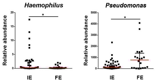 Relative abundance of bacterial genera with significant differences between IE and FE COPD patients. Data are presented as individual data points with median as a red line and IQR as black lines where * is p < 0.05.