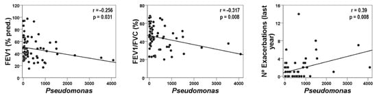 Relative abundances of microbial genera were also analyzed according to exacerbation phenotypes. FE patients presented a significant reduction in Haemophilus, whereas Pseudomonas were more abundant in this group (Figure 2), also showing an inverse relationship between these two microorganisms (Rho = 0.292, p < 0.05). None of these potentially pathogenic genera, however, showed any significant associations with the circulating inflammatory mediators nor with any of the eosinophilic-related gene transcripts. Nonetheless, it is worth noting that the acute phase protein CRP showed a clear tendency to be higher in FE patients as compared to IE (9.76 ± 11.6 vs. 9.42 ± 25.58 μg/mL, respectively, p = 0.058). Interestingly, the relative abundance of Pseudomonas was negatively correlated with some lung function variables (i.e., FEV1 and FEV1/FVC) and was positively associated with the number of exacerbations during the previous year (Figure 3).