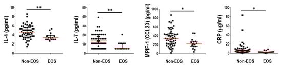Protein levels of circulating inflammatory markers with significant differences between Non-EOS and EOS patients. Data are presented as individual data points with median as a red line and IQR as black lines. *, p < 0.05: **, p < 0.01.