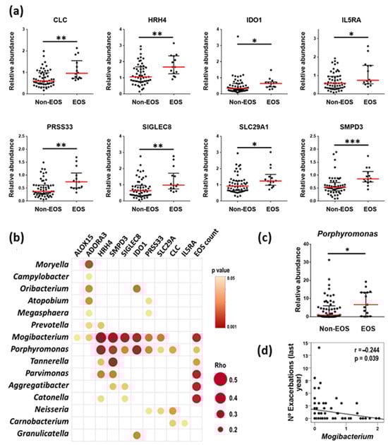 (a) Relative expression of eight eosinophil-related gene transcripts with significant differences between Non-EOS and EOS patients. Data are presented as individual data points with median (red line) and IQR (black lines). (b) Most representative direct (red) correlations between the level of eosinophilic-related gene transcripts and blood eosinophil counts with the relative abundance of bacterial genera. Bubble size represents the correlation coefficient and the intensity of bubble color represents the p value. (c) Relative abundance of Porphyromonas in EOS and Non-EOS COPD patients. (d) Spearman’s Rank correlation of relative abundance of Mogibacterium with the number of exacerbations during the previous year. Significances: *, p < 0.05; **, p < 0.01; ***, p < 0.001.