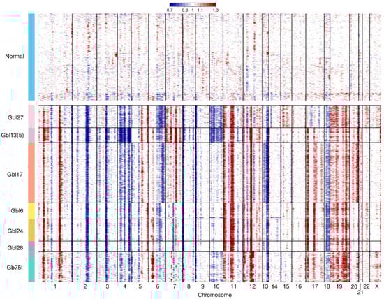 Copy-number aberrations detected in patient-derived glioblastoma cell lines and the tumor sample compared with normal brain genomic profile (at the top). Normal brain tissue data were obtained from GSE157827 (GSM4775574). The heatmaps show gains (red) and losses (blue) (Distribution of modified expression).