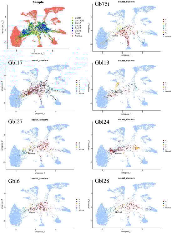 The UMAP dimensional reduction algorithm revealed clear structural separations based on molecular heterogeneity between the tumor and normal brain cells. We have found eight main segregated cell clusters in the normal brain, while none of the glioblastoma samples overlapped with it. Nevertheless, several inclusions of the Gb75t, Gbl13, and Gbl17 samples in the massif of normal tissue cells were observed, indicating the presence of some amount of non-malignant cells. In addition, bridges between the bulk of tumor cells and normal tissue were identified, which can be interpreted as an intermediate state between the normal and tumor phenotypes, but these cells were not abundant. A more detailed description regarding whether these cells belong to specific cell populations is given when analyzing the cell-clustering results for each sample.