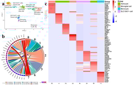 (a) UMAP plot of the scRNA-seq clustering from the intraoperative Gb75t sample from patient with glioblastoma IDH-wildtype. A total of eight clusters were found in this sample. Each cluster is colored differently and depicted by a number. Cell clusters were identified using two databases: CellMarker (upper line) and SingleCellBase (lower line); (b) GO Chord plot 0 cluster: GO:0035914 Skeletal muscle cell differentiation, GO:0002503 peptide antigen assembly with MHC class II protein complex, 1 cluster: GO:0048714 positive regulation of oligodendrocyte differentiation, GO:0031102 neuron projection regeneration, 2 cluster: GO:0040008 regulation of growth, 3 cluster: GO:0001788 antibody-dependent cellular cytotoxicity, 6 cluster: GO:0007399 nervous system development, 7 cluster: GO:1905686 positive regulation of plasma membrane repair (the full list of processes is presented in Table S3); (c) heatmap showing expression of the top genes associated with each cellular cluster (the full list of differentially expressed genes is presented in Supplementary Materials: Gb75t_heatmap.pdf).