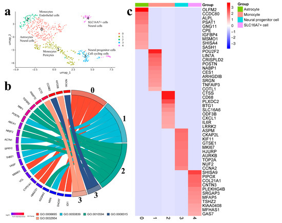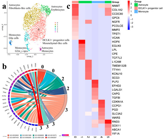 (a) Gbl6 (9 passage). Cell clusters identified in cell-culture sample using two databases: CellMarker (upper line) and SingleCellBase (lower line); (b) GO Chord plot 0 cluster: GO:0006695 cholesterol biosynthetic process, 1 cluster: GO:0050839 cell-adhesion molecule binding, 2 cluster: GO:0010594 regulation of endothelial cell migration, 3 cluster: GO:0008315 G2/MI transition of meiotic cell cycle, GO:0032954 regulation of cytokinetic process (the full list of processes is presented in Table S5); (c) heatmap showing expression of the top genes associated with each cellular cluster (the full list of differentially expressed genes is presented in Supplementary Materials: Gbl6_heatmap.pdf).