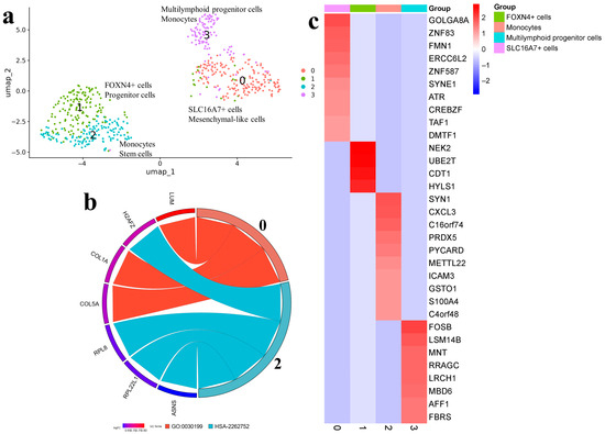 Cluster 0 was presented by SLC16A7+ cells (or mesenchymal-like cells) expressing SLC16A7, which is responsible for the transcription of the major pyruvate transporter MCT2. The differentially expressed markers were GOLGA8A, ZNF83 (DNA-binding transcription factor), FMN1, SYNE1, CREBZF (transcription factor) (Figure 5c). The markers COL1A, COL5A, and LUM were associated with collagen fibril organization (Figure 5b). In cluster 1, FOXN4+ cells (or progenitor cells) were categorized. Two markers, UBE2T and CDT1, were consistent across both databases. Monocytes 2 expressed RPL22L1, RPL8, ICAM3, and PRDX5, which are related to cellular responses to oxidative stress (Table S4). Cluster 3, according to the CellMarker, consisted of multilymphoid progenitor cells (Figure 5b,c; Supplementary Materials: Gbl13_info.xlsx).