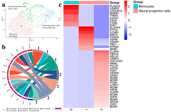 (a) Gbl27 (11 passage). Cell clusters identified in cell-culture sample using two databases: cell type assigned by CellMarker (upper line) and by SingleCellBase (lower line); G2m_s npcs (neural progenitor cells); (b) GO Chord plot 1 cluster: GO:0051987 positive regulation of attachment of spindle microtubules to kinetochore, GO:0051256 mitotic spindle midzone assembly, GO:0051383 kinetochore organization, 2 cluster: GO:1905463 negative regulation of DNA duplex unwinding, GO:1902975 mitotic DNA replication initiation, GO:0000727 double-strand break repair via break-induced replication, GO:0051095 regulation of helicase activity (the full list of processes is presented in Table S4); (c) heatmap showing expression of the top genes associated with each cellular cluster (the full list of differentially expressed genes is presented in Supplementary Materials: Gbl27_heatmap.pdf).