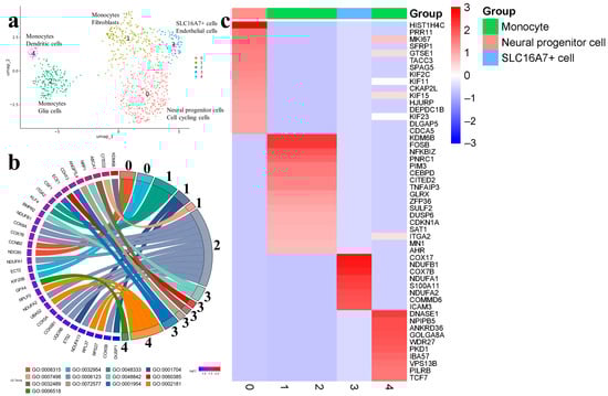 (a) Gbl24 (7 passage). In total, five cell clusters are identified in cell-culture sample using two databases: CellMarker (upper line) and SingleCellBase (lower line); (b) GO Chord plot 0 cluster: GO:0008315 G2/MI transition of meiotic cell cycle, GO:0032954 regulation of cytokinetic process, 1 cluster: GO:0048333 mesodermal cell differentiation, GO:0001704 formation of primary germ layer, GO:0007498 mesoderm development, 2 cluster: GO:0006123 mitochondrial electron transport, cytochrome c to oxygen, 3 cluster: GO:0048842 positive regulation of axon extension involved in axon guidance, GO:0060385 axonogenesis involved in innervation, GO:0032489 regulation of Cdc42 protein signal transduction, GO:0072577 endothelial cell apoptotic process, GO:0001954 positive regulation of cell-matrix adhesion, 4 cluster: GO:0002181 cytoplasmic translation, GO:0006518 peptide metabolic process (the full list of processes is presented in Table S5); (c) heatmap showing expression of the top genes associated with each cellular cluster (the full list of differentially expressed genes is presented in Supplementary Materials: Gbl24_heatmap.pdf).