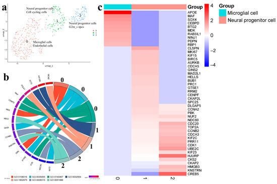 (a) Gbl28 (5 passage). Cell clusters identified in cell-culture sample using two databases: cell type assigned by CellMarker (upper line) and by SingleCellBase (lower line); G2m_s npcs (neural progenitor cells); (b) GO Chord plot 0 cluster: GO:0106016 positive regulation of inflammatory response to wounding, GO:0035455 response to interferon-alpha, GO:0140467 integrated stress-response signaling, 1 cluster: GO:0032954 regulation of cytokinetic process, GO:1902975 mitotic DNA replication initiation, 2 cluster: GO:0008315 G2/MI transition of meiotic cell cycle, GO:0051988 regulation of attachment of spindle microtubules to kinetochore (the full list of processes is presented in Table S5); (c) heatmap showing expression of the top genes associated with each cellular cluster (the full list of differentially expressed genes is presented in Supplementary Materials: Gbl28_heatmap.pdf).
