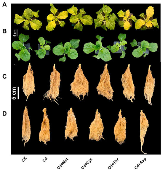 The changes in different growth stages of Chinese cabbage (fully expanded leaves at the 5th, 6th, and 7th stages) under Hoagland’s solution and 5 μM Cd treatment were observed (Figure A1A). The phenotypes of Chinese cabbage under control conditions and those treated with 5, 10, and 20 μM Cd were assessed (Figure A1C). The application level of AAs (50 μM) was determined based on our preliminary phenotypic screening at varying concentrations (25, 50, 100, and 200 μM) of AAs (Figure A2A–D and Figure A3). Each seedling was transferred to a plastic pot (height of 120 mm, top diameter of 93 mm, and bottom diameter of 63 mm), which was then filled with 400 mL of Hoagland’s solution to provide the necessary nutrients. Treatments were applied for 10 days as follows: (1) control treatment (CK); (2) Cd (5 μM CdCl2); (3) Cd (5 μM) + Met (50 μM); (4) Cd (5 μM) + Cys (50 μM); (5) Cd (5 μM) + Thr (50 μM); and (6) Cd (5 μM) + Asp (50 μM). All treatments commenced at the 5th fully expanded leaf stage. Each treatment was replicated three times, and each pot contained one seedling.