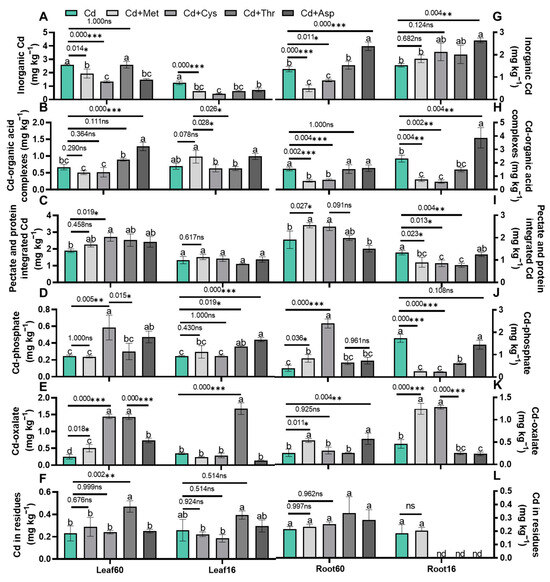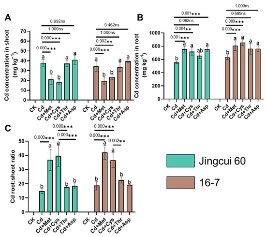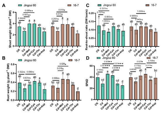 Effect of Met, Cys, Thr, and Asp on Chinese cabbage (Jingcui 60 and 16-7) shoot weight (g plant−1 DW) (A), root weight (g plant−1 DW) (B), root-to-shoot ratio (C), and soil plant analysis development (SPAD) values (D) under 5 μM Cd stress. Each value represents the mean ± SD (n = 3). Letters a–c indicate significant differences between treatments at p < 0.05. ANOVA with Tukey’s post hoc test used for the parametric analysis. Asterisks indicate significant differences between two groups: * p < 0.05; ** p < 0.01; *** p < 0.001. ns indicates no significant difference.