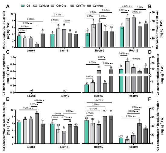 Effect of Met, Cys, Thr, and Asp applications on the subcellular distribution of Cd in the shoot (A,C,E) and root (B,D,F). “nd” indicates "not detected". Leaf60 refers to the leaf of the Jingcui 60 cultivar, Leaf16 refers to the leaf of the 16-7 cultivar, Root60 refers to the root of the Jingcui 60, and Root16 refers to the root of the 16-7 cultivar. Plant cells were separated into cell wall fraction (Fcw), organelle fraction (Fo), and soluble fraction (Fs), where n = 3. Letters a-c indicate significant differences between treatments at p < 0.05. ANOVA with Tukey’s post hoc test was used for the parametric analysis. Asterisks indicate significant differences between two groups: * p < 0.05; ** p < 0.01; *** p < 0.001. ns indicates no significant difference.