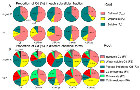 Moreover, we assessed the average proportion of Cd in the subcellular distribution, revealing that Cd was predominantly localized in the cell wall fraction, accounting for 33–68% of the total (Figure 6A). On average, the cell wall fraction contained 43% of the total Cd in Jingcui 60 and 61% in the 16-7 cultivar (Figure 6A). The soluble fraction was 54% for Jingcui 60 and 26% for 16-7, and the organelle fraction was 4% for Jingcui 60 and 13% for 16-7 (Figure 6A). The results of the principal component analysis (PCA) demonstrate a positive correlation between Cd concentration in the shoots and the root soluble fractions of both varieties, which was contrasted by a discernible negative association with Cd in the cell wall and organelle fractions (Figure 7A). In the cell wall fraction, the order for Jingcui 60 was Cd + Met (53%) > Cd + Cys (52%) > Cd (38)% > Cd + Thr (37%) > Cd + Met (33%), and for the 16-7 cultivar, it was Cd + Cys (68%) = Cd (68%) > Cd + Met (67%) > Cd + Asp (54%) > Cd + Thr (47%) (Figure 6A). These results indicate that the addition of AAs alters the distribution of Cd in the subcellular fractions, particularly in the cell wall fraction, and there are differences between the two cultivars.