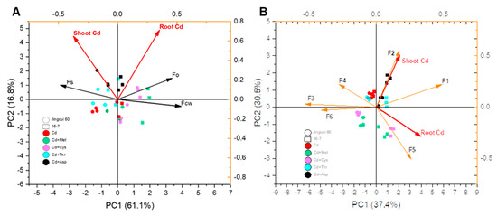 Principal component analysis (PCA) was used to examine the relationship between the subcellular distribution and chemical forms of Cd in the root, and Cd concentrations in the shoot and root (A,B). The circle and square refer to the samples from the Jingcui 60 and 16-7 cultivars, respectively. The colors (red, green, pink, blue, and black, respectively) represent Cd, Cd + Met, Cd + Cys, Cd + Thr, and Cd + Asp treatments. Abbreviations: shoot Cd, Cd concentration in the shoots; DW, dry weight; Fcw, cell wall fraction; Fo, organelle fraction; Fs, soluble fraction; F1, inorganic Cd extracted by 80% ethanol; F2, Cd-organic acid complexes extracted by DI water; F3, pectate-integrated Cd; F4, insoluble Cd-phosphate; F5, Cd-oxalate; F6, Cd in the residues.