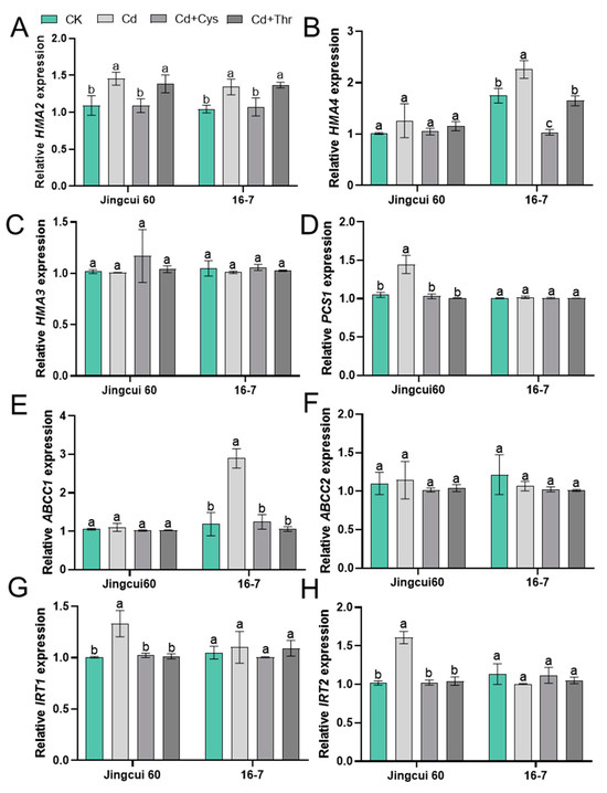The expressions of HMA2, HMA4, HMA3, PCS1, ABCC1, ABCC2, IRT1, and IRT2 in roots of both cultivars under Cd + Cys and Cd + Thr treatments (A–H). Data are presented as means ± SD, and different letters on the bars indicate significant differences at p < 0.05 (n = 3 plants for each replicate). ANOVA with Tukey’s post hoc test was used for the parametric analysis.