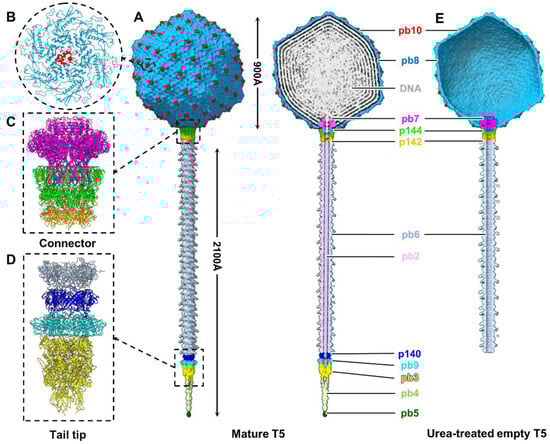 - Vernhes, E.; Renouard, M.; Gilquin, B.; Cuniasse, P.; Durand, D.; England, P.; Hoos, S.; Huet, A.; Conway, J.F.; Glukhov, A.; et al. High affinity anchoring of the decoration protein pb10 onto the bacteriophage T5 capsid. Sci. Rep. 2017, 7, 41662. [Google Scholar] [CrossRef] [PubMed]