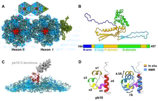 In comparison with the previous study of the T5 head [], we built a more accurate atomic model of the pb8 monomer from residues 164–457 (out of 458 residues) based on our high-resolution density map (Figure 2A and Figure S5). MCP pb8 adopts a canonical HK97-like fold [] and can be divided into four domains (Figure 2B and Figure S5): an extended N-arm (residues 164–191), a P-domain (residues 192–205, 245–306, and 407–451), an E-loop domain (residues 206–244), and a complex A-domain (residues 307–406, and 452–457). During the maturation of the capsid, the first 160 residues of the N-terminus of pb8 undergo proteolytic cleavage [], and this process also occurs in the MCPs of E217 [] and HK97 []. The asymmetric unit of the icosahedral head comprises 13 MCP gp8 monomers (a fifth penton, a hexon I, and a hexon II) and 2 pb10 monomers (Figure 2A). The center of each hexon is adorned with a decorating protein pb10, which comprises an α-helical domain and an immunoglobulin (Ig)-like domain (Figure 2C) []. We resolved only the α-helical domain (Figure 2D), from residues 2 to 68 (out of 164 residues), which contains five α-helices: α1 (residues 4–10), α2 (residues 17–24), α3 (residues 25–30), α4 (residues 33–41), and α5 (residues 49–62). A structural comparison of our α-helical domain with the nuclear magnetic resonance (NMR) structure of pb10 in solution [] reveals that the α1 and α2 of the pb10 monomer undergo substantial conformational changes from the solution state to the assembled state (Figure 2D). All gp10 proteins bind to hexons with notably high affinities, primarily through a series of hydrogen bonds and salt bridges (Figure S6). Notably, pb10 is proposed to enhance the stability of hexons and protect the phage from releasing its DNA under extreme conditions []. There is evidence suggesting that pb10 exhibits an elongated density of binding to the hexon, with some preferred orientations, and has distinct binding sites in two types of hexons []. In contrast, our high-resolution structure indicated that the binding sites of pb10 were consistent in all hexons, likely due to minor conformational changes in the centers of the two types of hexons (Figure S6). We were unable to resolve the Ig-like domain of pb10 due to its flexibility (Figure 2C). Notably, pb10 may interact with host cells during infection []. Our findings indicate that pb10 provides structural stability and may facilitate initial host interactions in the early stages of infection.