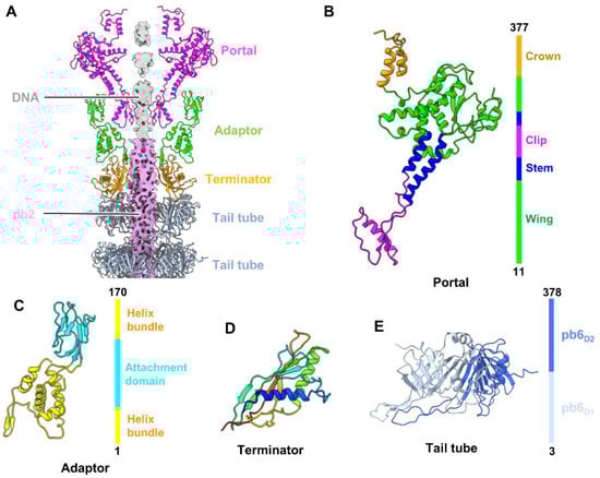 - Liang, L.; Zhao, H.; An, B.; Tang, L. High-resolution structure of podovirus tail adaptor suggests repositioning of an octad motif that mediates the sequential tail assembly. Proc. Natl. Acad. Sci. 2017, 115, 313–318. [Google Scholar] [CrossRef] [PubMed]