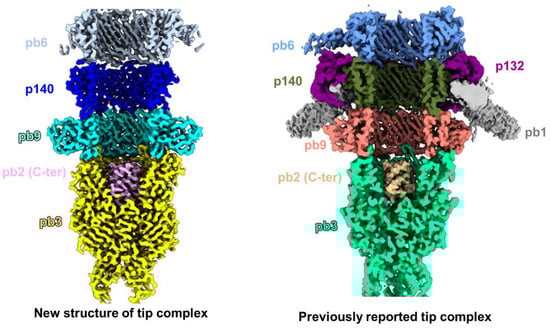 Density maps for the structure determined in this study and the previously reported (EMD-14869) tip complexes in mature T5. The newly determined structure lacks tail fiber pb1 and collar protein p132.