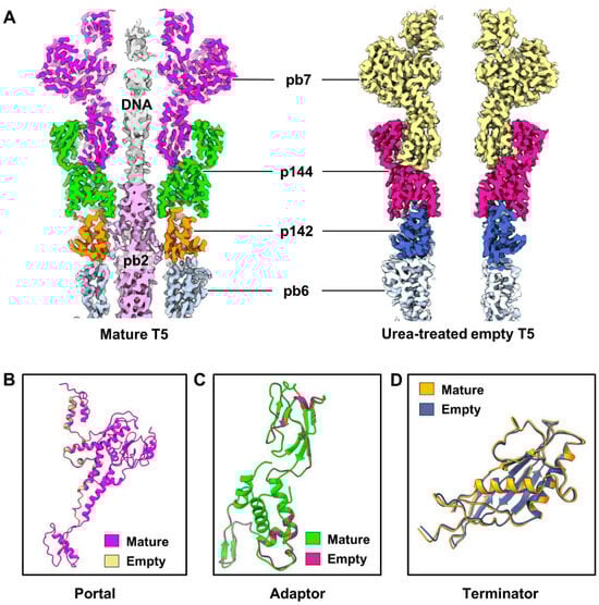 The release of the TMP and DNA in urea-treated T5 results in an empty tail and an empty head (Figure 1A,E). However, in both the mature and urea-treated states, the head remains unchanged due to the exceptional stability of the icosahedral shell. Structural comparisons of the portal, adaptor, and tail terminator proteins before and after DNA release indicated that no discernible conformational changes had occurred in these regions during infection (Figure 5). To date, obvious conformational changes following DNA release have only been described in the SPP1 connector complex []. However, most reported myophages and siphophages, such as DT57C [], XM1 [], and E217 [], exhibit similarities to T5 in terms of the connector complex. In the mature state, the negative electrostatic potential inside the connector channel and TMP collectively prevent the release of DNA. In the DNA-ejected state, once the interaction of the tail tip complex or baseplate with the host cell induces the release of TMP [,,], the large space of the connector complex enables the passage of DNA. Therefore, the connector complex may not be directly involved in the aforementioned processes. No significant differences were observed in the conformation of connector proteins before and after DNA release, and these proteins appear to be conserved across myophages and siphophages. Notably, the tip complex of the empty particle became detached for urea-treatment-induced reasons.