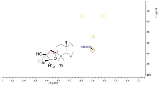 Long-range C-H hetero-correlation (HMBC) between the signals of C-3 (88.4 ppm) and H-3′b on the side chain (3.81 ppm) of compound 15.